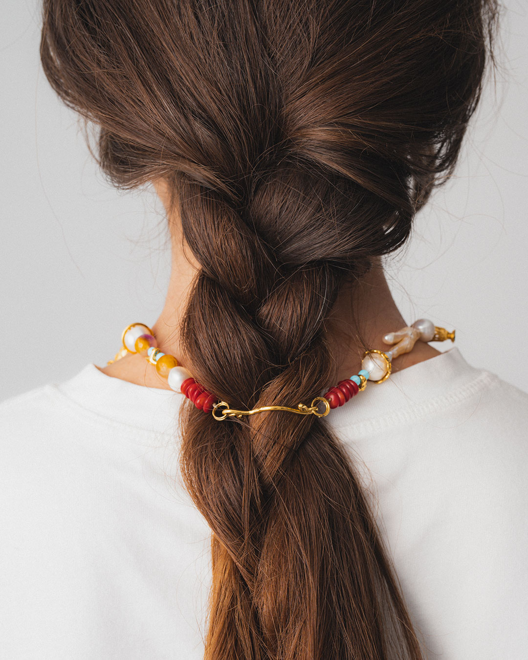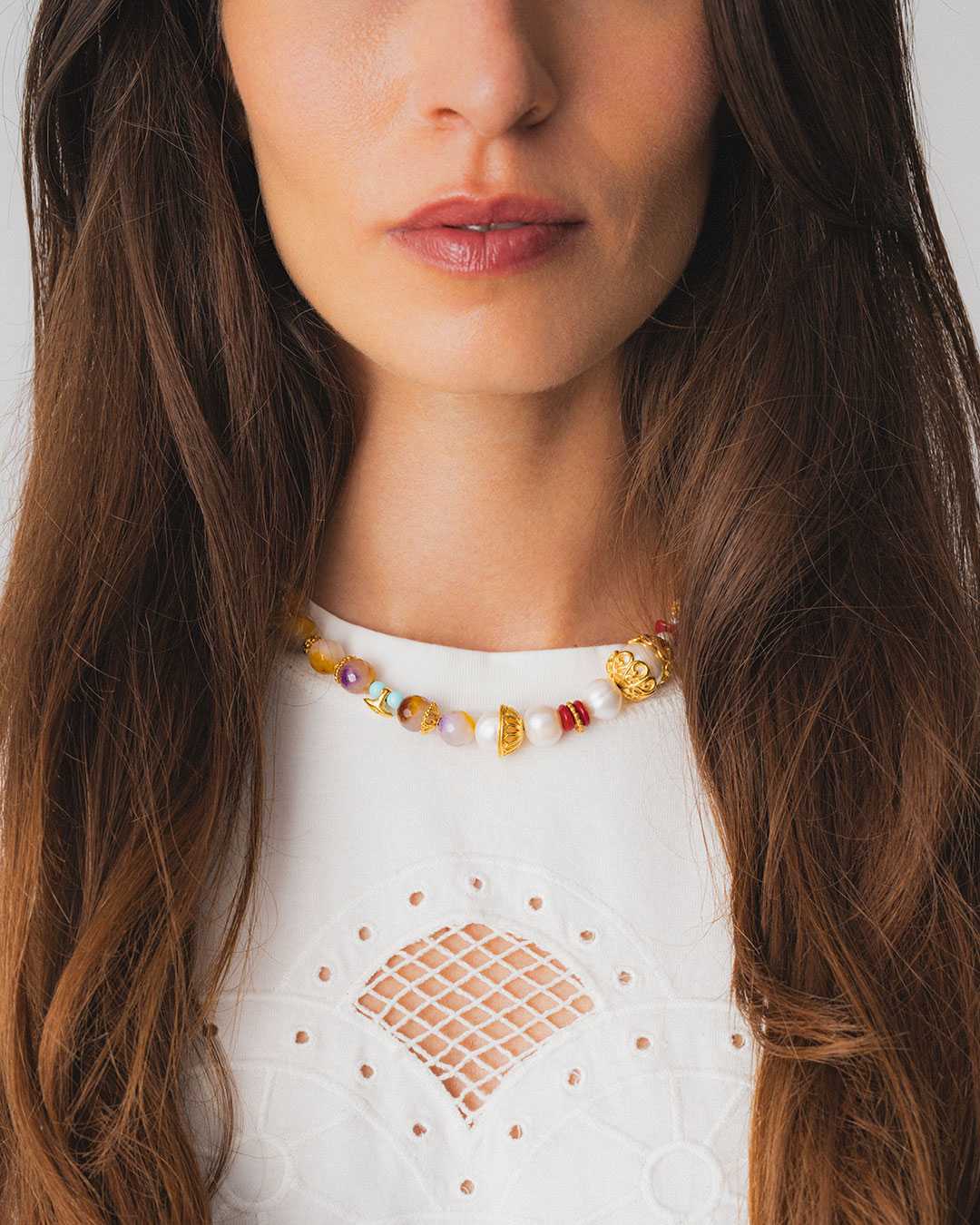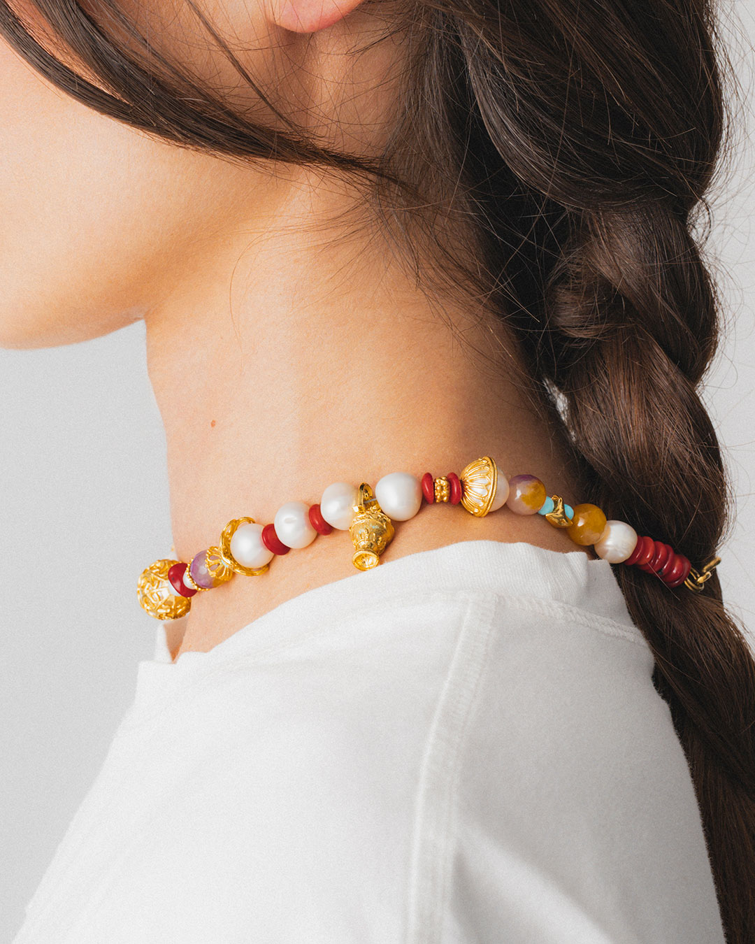 A true party piece, this necklace weaves ancient amphora motifs with delicate lace-like patterns, sprinkled with pearls of every size, vibrant stones, and coral accents—an enchanting, one-of-a-kind treasure.